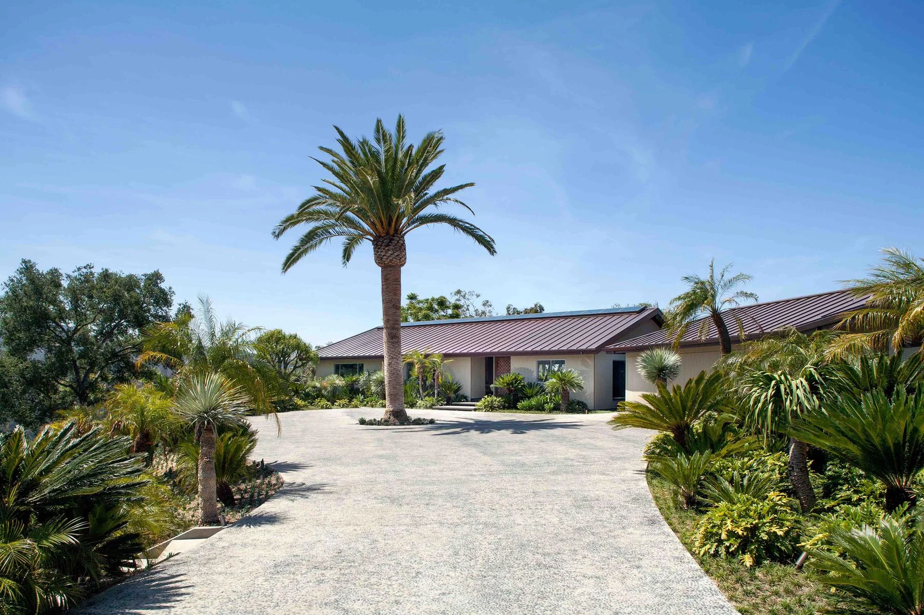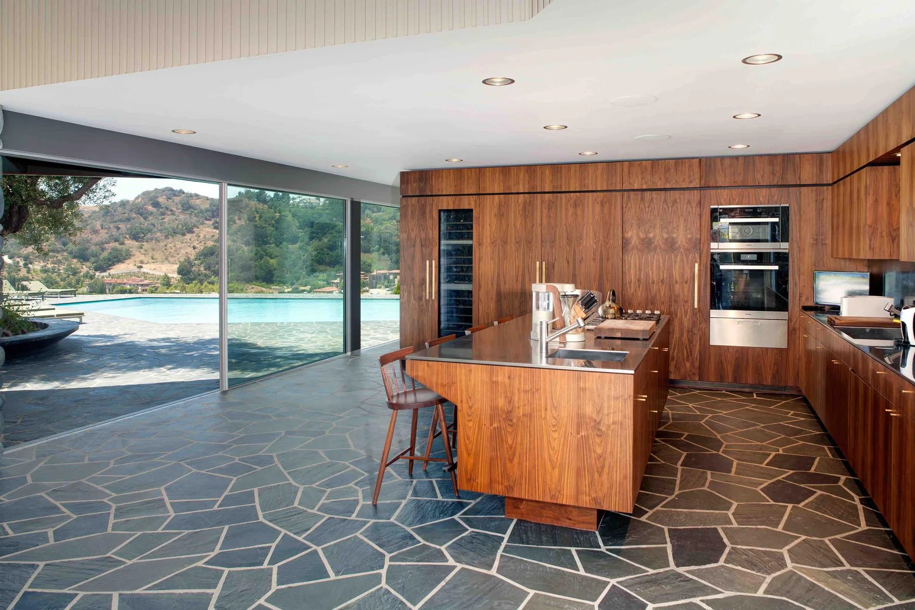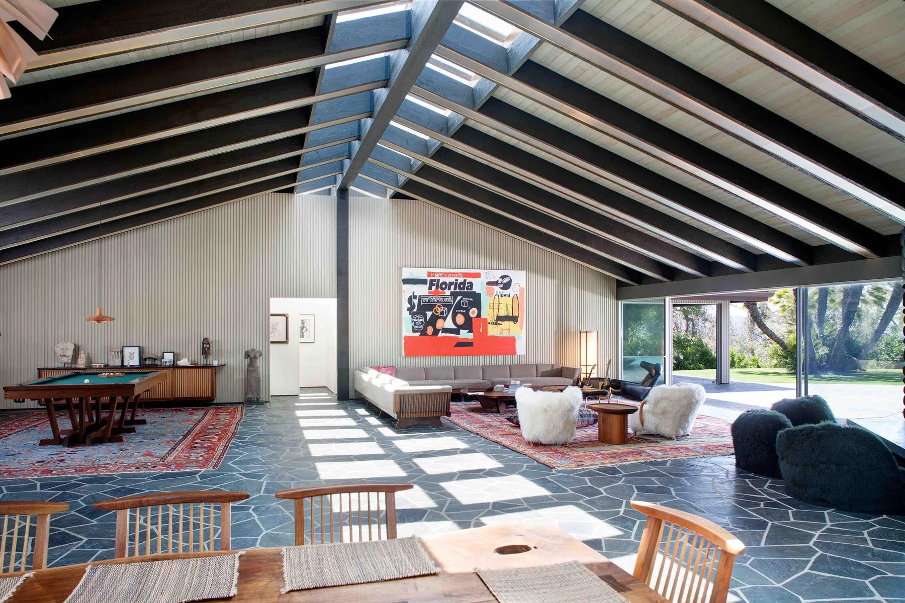 The 7,100-square-foot house in Benedict Canyon has a distinctly midcentury-modern look to it, with exposed beam ceilings, a towering stone fireplace, and floor-to-ceiling sliding glass doors throughout.